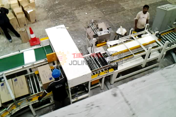 石蠟全自動包裝線:蠟塊通過斜坡輸送機傳送到疊摞皮帶機整列--通過過濾皮帶機傳送到轉向鏈板機--當進入橫向移載鏈板機后將蠟塊推入熱封切機內準備套膜封切收縮--蠟包暫存--紙箱自動開箱--蠟包自動定位--側推式自動裝箱機--側邊式折蓋封箱機--捆包--外箱噴碼--碼垛區暫存輸送--自動碼垛--在線裹膜等一系列包裝工藝流程。