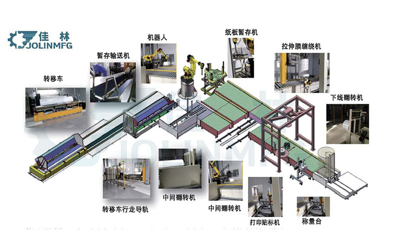 佳林“無紡布自動包裝線”集ERP和MES系統、周轉搬運、生產線合流、機器人自動碼垛、自動放紙板、自動纏膜打包、自動覆頂膜、自動尼龍袋纏繞包裝、自動稱重、自動打印貼標 、自動翻轉下線、自動入庫、立體倉庫等下游流程。